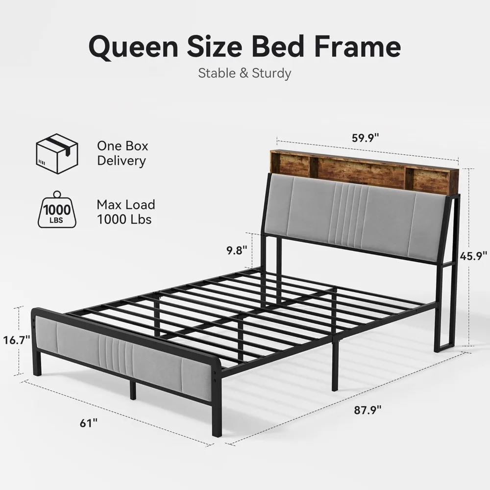 Queen Size Bed Frame with Storage Headboard and Charging Station, Ergonomic Platform Bed Frame